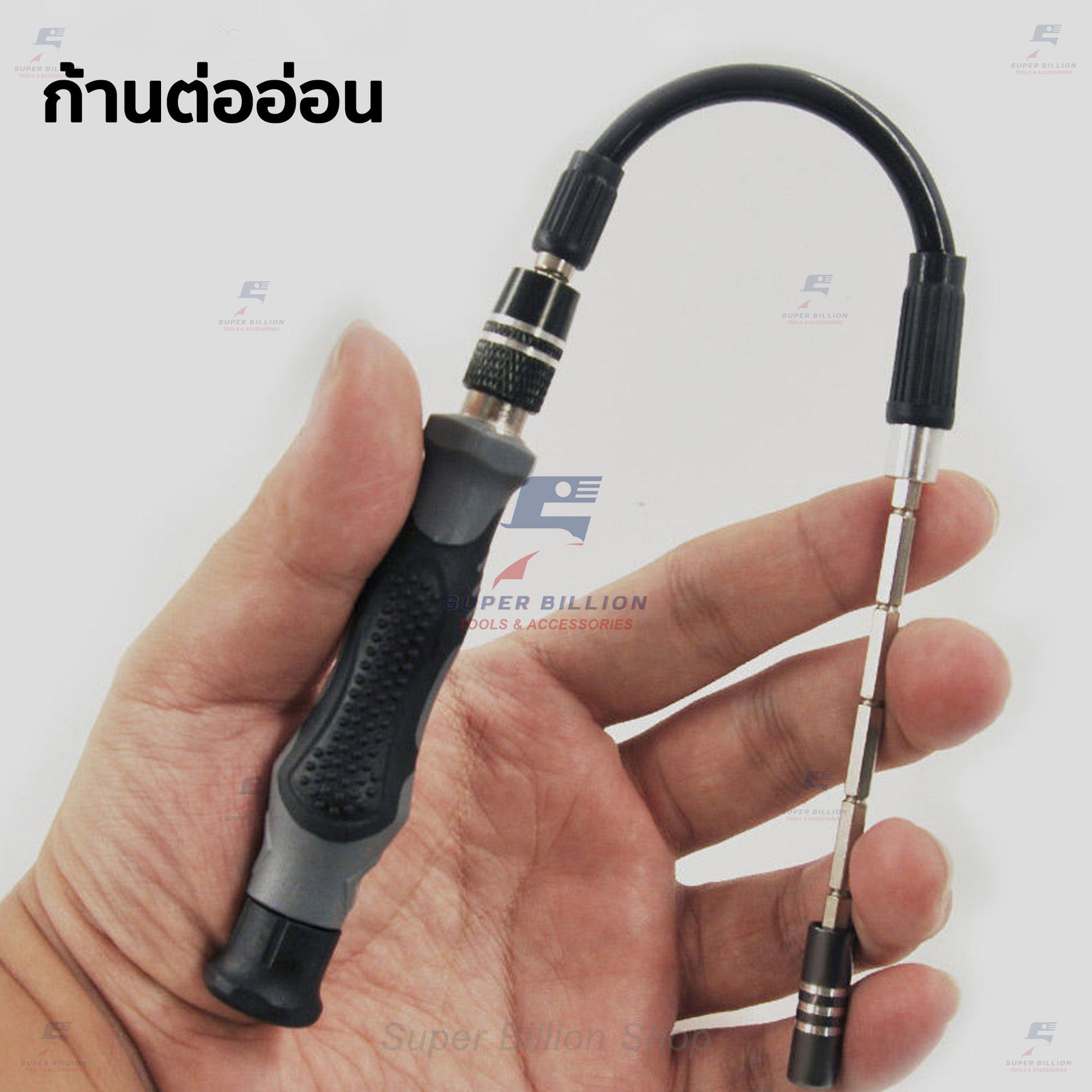 ภายในชุดประกอบด้วยไขควงด้ามจับกันลื่นแบบ TPR พร้อมก้านต่อขยายทั้งแบบแข็งและแบบอ่อน สามารถปรับระดับความยาวได้ตามต้องการ หัวไขควงทำจากเหล็กโครเมียมคุณภาพสูง แข็งแรง ทนทาน ปลายก้านแม่เหล็กแรงสูงช่วยดูดสกรูไม่ให้หล่นหาย