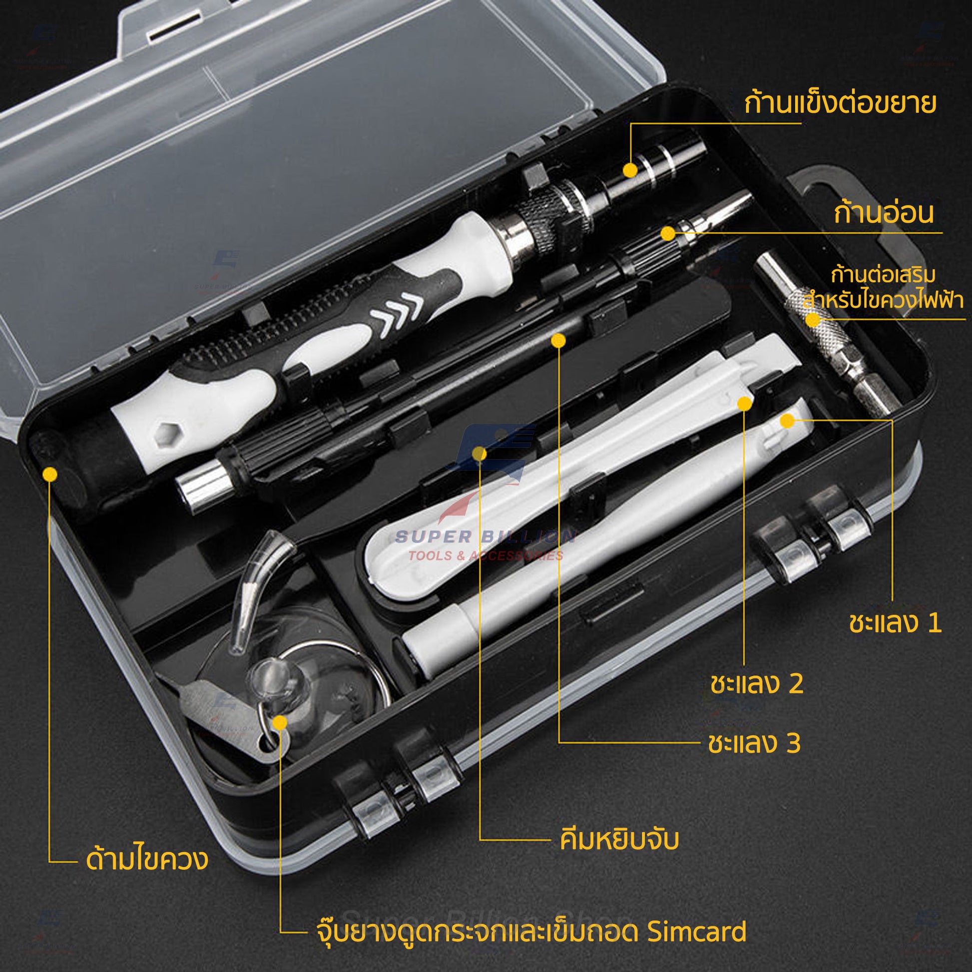 ครบเซ็ตในกล่องเดียว เหมาะสำหรับการซ่อมแซมอุปกรณ์อิเล็กทรอนิกส์ทุกชนิด เช่น โทรศัพท์มือถือ Laptop คอมพิวเตอร์ กล้อง โดรน นาฬิกา และอุปกรณ์อื่น ๆ