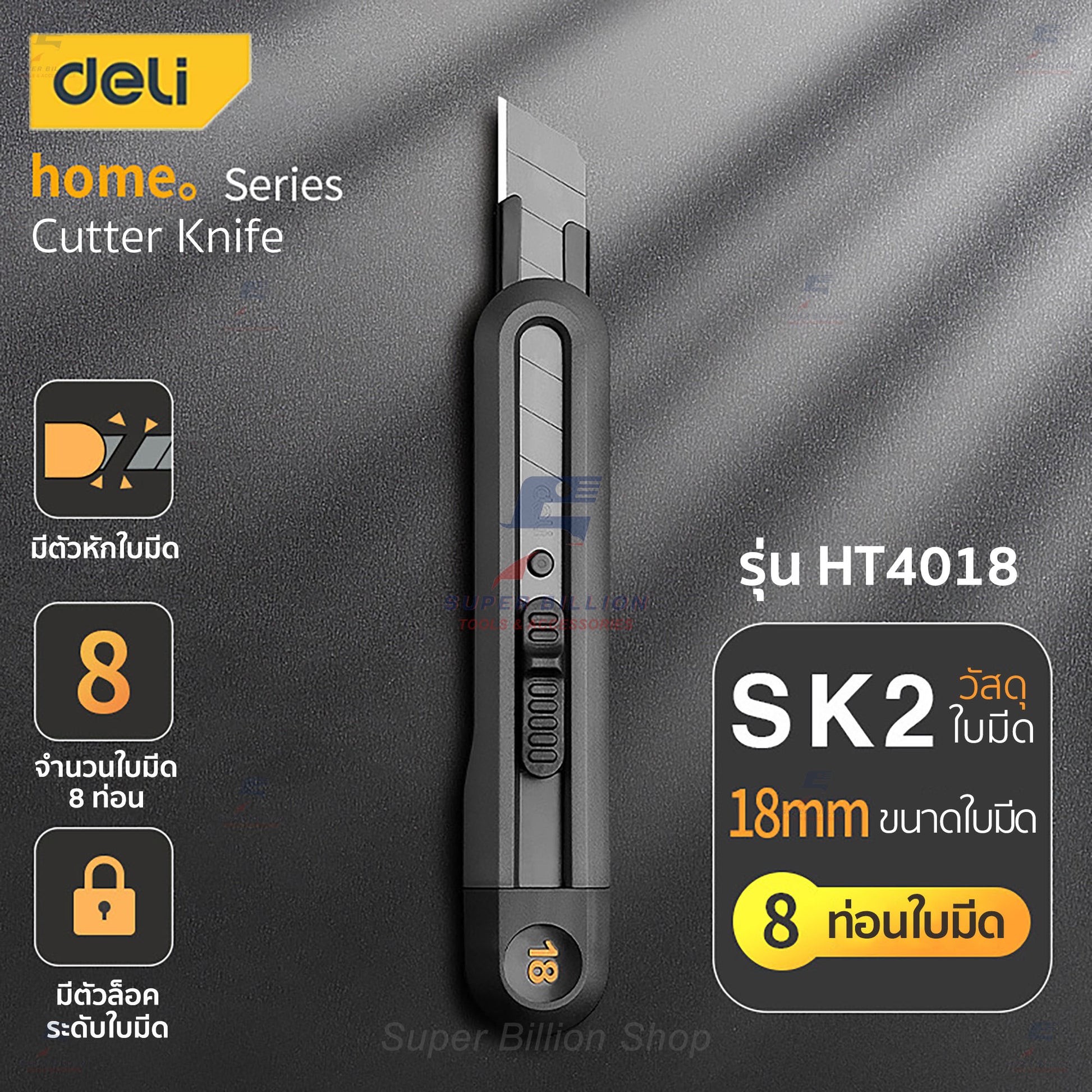 คัตเตอร์คุณภาพจากแบรนด์ Deli ออกแบบมาเพื่อความสวยงามและการใช้งานที่ปลอดภัย ตัวด้ามทำจากพลาสติก ABS แข็งแรง จับถนัดมือ มาพร้อมใบมีดเหล็กคาร์บอน SK2 ที่มีความคมสูง ตัดได้เรียบเนียน ใช้งานได้ยาวนาน